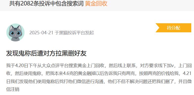 当然,当联系平台回收时,更多的人知道他们购买的黄金商品存在假货。。这样的案例在黑猫投诉中层出不穷。