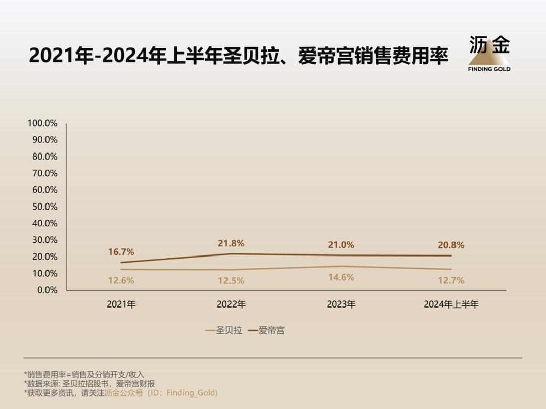 但是光鲜亮丽的社交名片背后是烧钱的营销。近年来,爱帝宫的销售费用率一直保持在20%左右,圣贝拉的费用率略低,但随着店铺的扩张,也有上升的趋势。