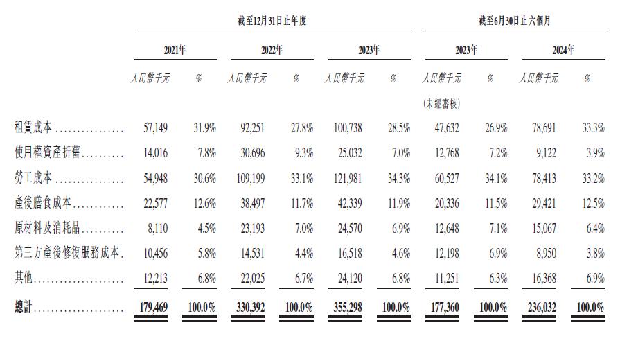 高昂的成本稀释了大部分毛利,其中最高的就是租金。