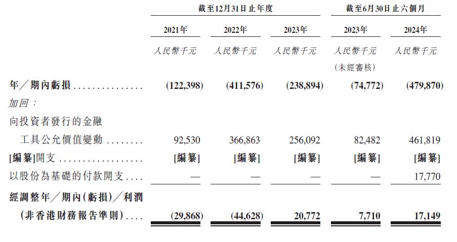 招股书显示,2021-2023年和2024年上半年,圣贝拉净亏损分别为1.22亿、4.12亿、2.39亿、4.80亿,3年半累计亏损超过12亿元,即使将与经营无关的亏损调整下来,2024年上半年调整后的利润也只有1715万元。