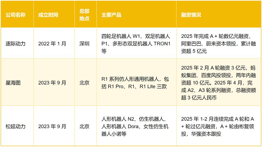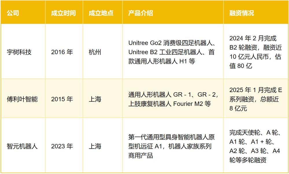 总的来说,龙头企业已经到了独角兽阶段,比如宇树科技(估值80亿)、傅利叶智能(E轮)、智元机器人(融资超过6轮)。