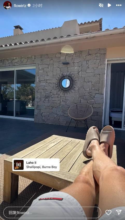 维尔茨在社交平台上晒出了自己在度假的照片,并配上了自己的照片。 Shallipopi 和 Burna Boy 的歌曲《Laho II》,照片中的他看上去非常悠闲。