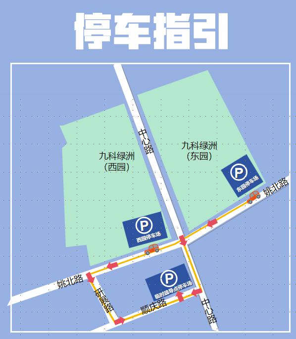 九科绿洲设有东、西园停车场和临时疏导点停车场。