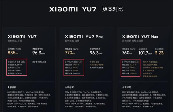 三个版本的小米YU7都配备了小米V6s电机。 Plus电动机 功率并不同