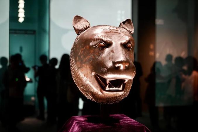圆明园兽首和海外回流文物特展现场。图为虎首原件。