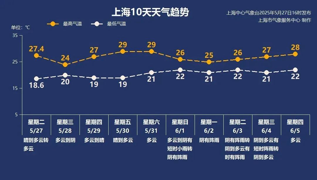 5月底前,上海以多云天气为主,气温波动不大,最低19~21℃,最高27~29℃,早晚舒适,白天微热。受气流东移影响,6月1日至3日,申城将出现明显的降水过程,同时风速增加。端午节假期期间,大家要注意最新的预报信息,做好出行和生活安排。