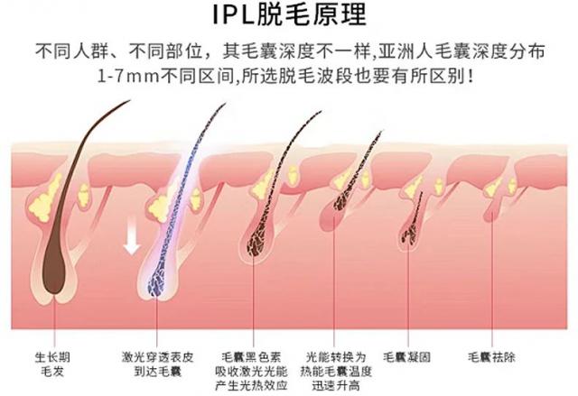 它采用的是就像美容院的脱毛器一样。 IPL 脉冲光,让 510 — 1200nm 精确的波长穿过表皮直接作用于毛囊黑色素,产生热效应。