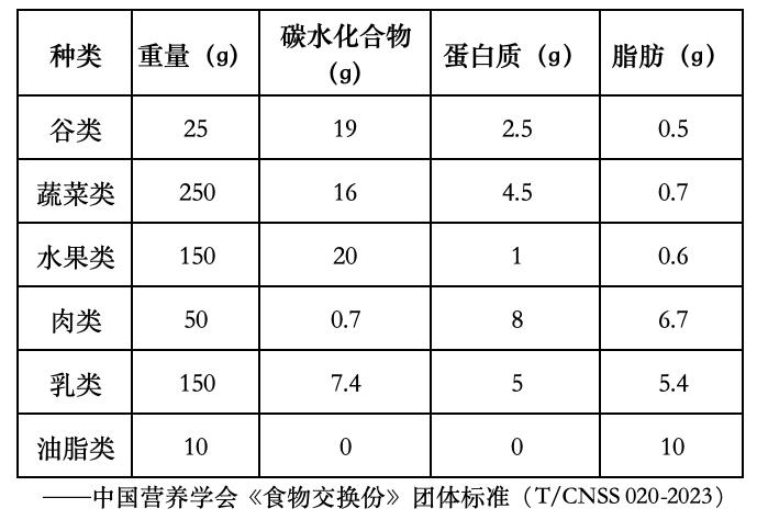 食物交换法根据来源和特点将食物分为几类。同类食物在一定重量内所含的蛋白质、脂肪、碳水化合物和能量接近。一般来说,每产生80-90千卡热量的食物是“一份”,常见的“一份”食物的相应重量可以粗略计算如下。
