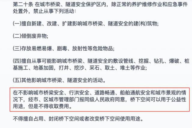 根据《武汉市城市桥梁隧道安全管理条例》,“桥下空间可用于公益用途,但不收费”(图) / 武汉市城管政法委)