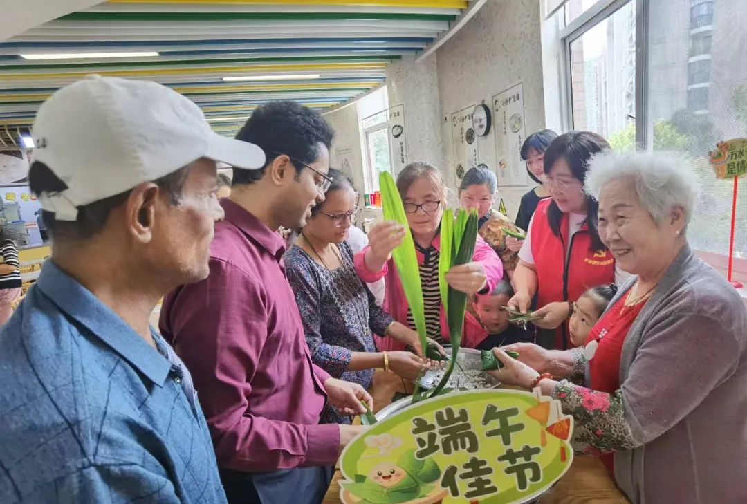 居民和国际朋友一起包粽子