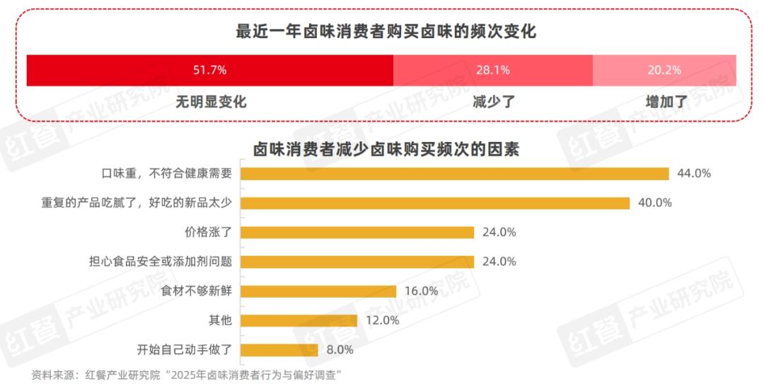 根据红餐产业研究院“2025年对卤菜消费者的行为和偏好调查”,近一年来,51.7%的受访者购买卤菜的频率没有太大变化。购买频率增加的消费者比例与购买频率下降的消费者比例相似。,这种情况表明,卤菜的消费群体相对稳定。