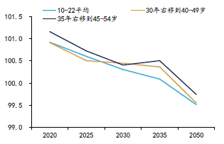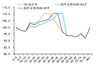 图片:消费右移的假设状态 信息来源:Wind,注:(1)2010-2022年东吴证券研究所平均消费支出=100;(2)控制两种右移假设下各年龄段的平均支出为100,即假设人均消费支出不变。