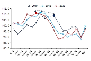 图片:2010-2022年人均收入“驼峰左移” 信息来源:CFPS,东吴证券研究所;注:各年龄段平均收入=100