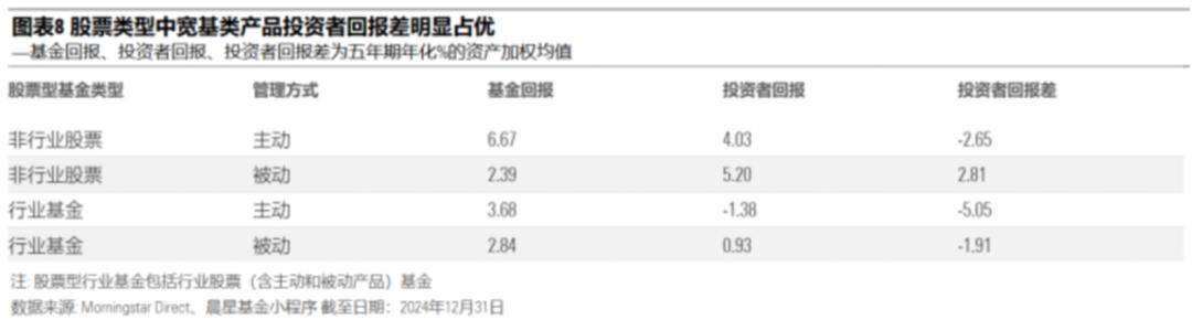 此外,根据晨星发布的《中国公募基金投资者收益差调查报告》,宽基被动产品的投资效果明显优于主动权益基金,从投资者收益与基金回报的差异(即投资回报差)来看。