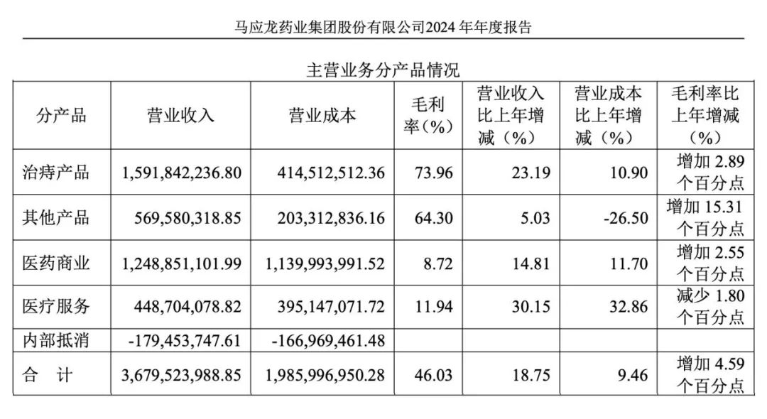 2024年,马应龙的业务主要是医药行业、医疗服务和医药商业三大业务线,三大板块的营业收入分别为21.61亿元、12.49亿元和4.49亿元。在医药行业,治疗痔疮的商品收入达到15.92亿元,占医药行业收入的73%,占公司营业总收入的40%以上,毛利率高达73.96%。