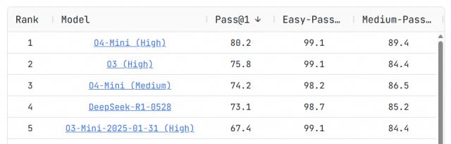 模型代码能力检测标准 LiveCodeBench 上,DeepSeek-R1-0528 已跃升至榜单第四,略逊于榜单, o4-Mini(Medium),但和 o3-Mini 打得有来有回,直接被闭源。 OpenAI 包围了。