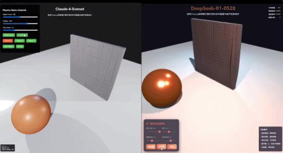 根据官方案例,R1-0528 与物理学世界相比,推理能力的确比 Claude-4-Sonnet 要好。在破坏砖墙之后,圆球的不规则坍塌更符合物理规律。