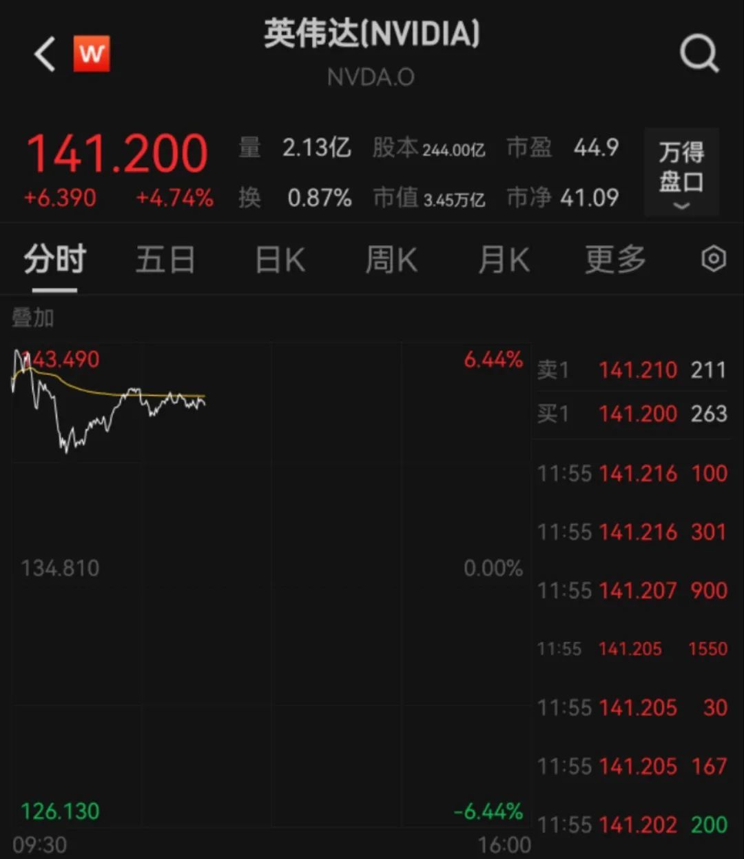 今日英伟达开盘后一度上涨6%以上,随后下跌。截至发稿时,英伟达的股价上涨了4.74%,每股141.2美元。总市值超过微软,再次登上全球市值第一宝座。