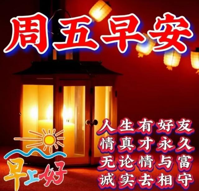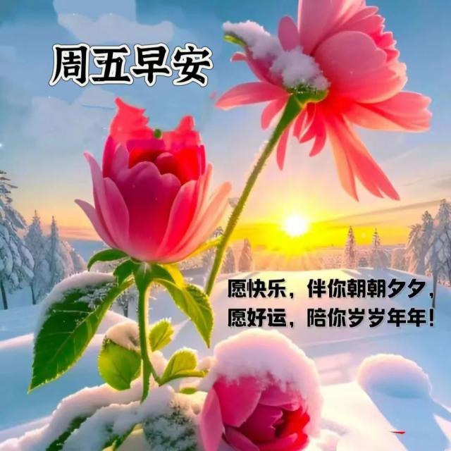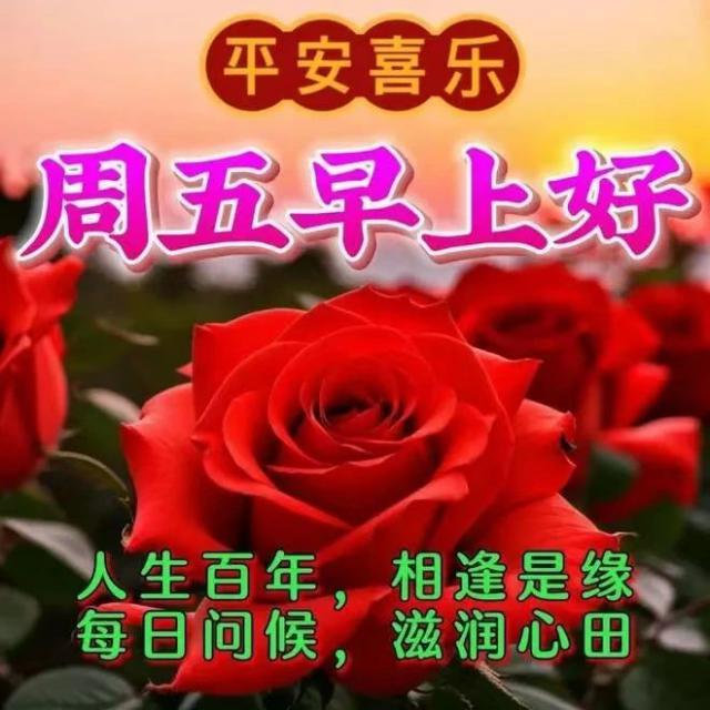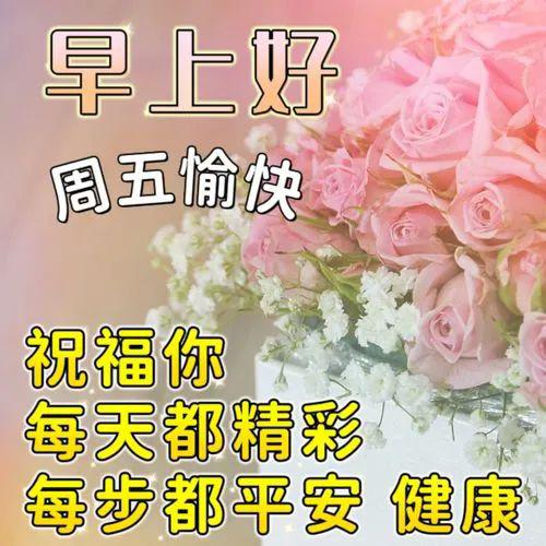 星期五早上好!一份祝福总是在晨光中到来。一份快乐总是像晨光一样绽放。一份关注,永远陪伴你每一天的精彩。一份美好的工作,永远祝你新的大胆。愿我的祝福让你每天都开心,幸福永远在那里!早上好!