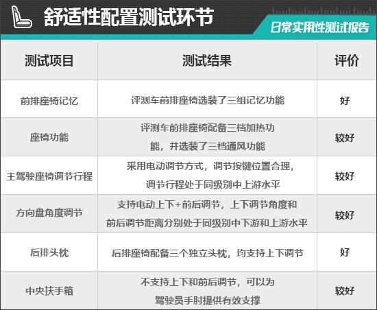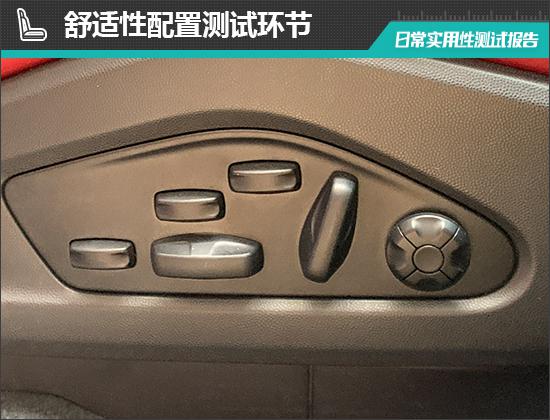 在座椅方面,评估车主驾驶座椅的电动调节按钮位于座椅侧面,调节按钮位置合理。此外,评估车前座配备三组记忆功能,前座配备三档加热功能,三档通风功能,舒适性配置更好。