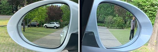 车辆左侧外后视镜采用双曲率镜片,右侧外后视镜为普通镜片。根据实际测量,左右外后视镜的视野范围是 27.1 ° 和 21.6 °,测试过的同级别车型,各自处于中上游和中游水平。