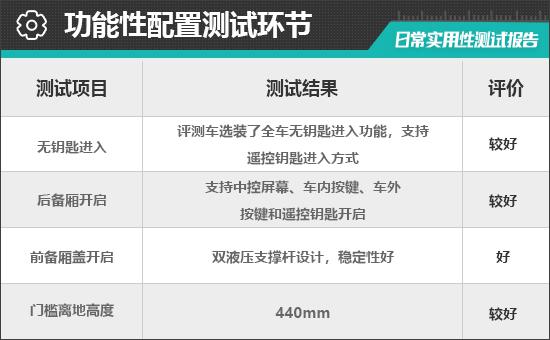 对消费者而言,门槛离地高度在一定程度上决定了上下车的便利性。根据实际测量结果,对汽车门槛离地高度的评估 440mm,达到同级别车型的平均水平,驾驶员每天上下车比较方便。