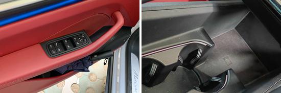 对车内使用空间的检测,仅针对前排触手可及的空间,不包括手套箱、中央扶手箱等需要启动的空间。测试方法是将以下所有固定物品放置在前排的每一个储物空间中,通过固定物品的放置状态来判断车辆储物空间的性能。检验选定的固定物体如下:2 一瓶常规大小的矿泉水, 大屏幕手机,1 支口红、1 个挎包、1 副墨镜、1 把折叠伞和 1 包装常规尺寸的抽纸。
