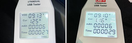 另外,我们是对的 USB 测试了接口的电压和电流。其中,前排 USB Type-C 接口的电压和电流分别是 9.13V 和 1.25A;后排 USB Type-C 接口的电压和电流分别是 9.1V 和 1.16A。
