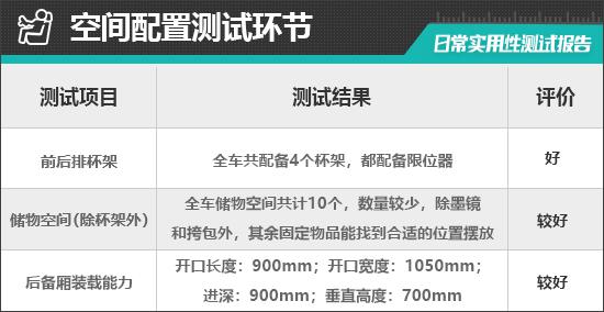 实际测量后,测试车的储物能力一般。除了墨镜和挎包,其他固定物品都可以找到合适的位置放置。需要指出的是,测试车门的储物空间容量较小。虽然中控台下面的储物槽容量很大,但是拿放物品不是很方便。