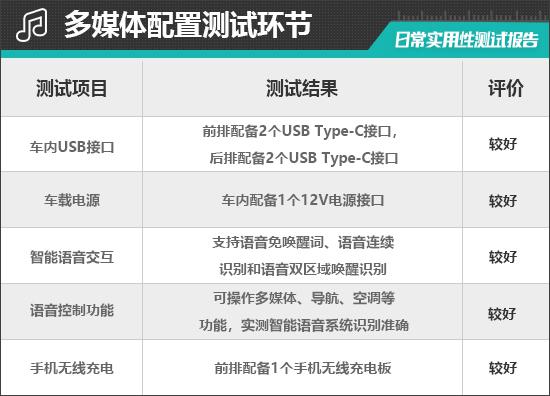 对车辆配置进行评估 4 个 USB Type-C 接口,其中,前排 2 一个接口位于中控台下方,后排 2 一个接口位于后空调风口下方,布局合理但兼容性差;同时,车内还提供 1 个 12V 电源接口,能满足车内乘客多种电子产品的用电需求。