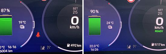 另外,我们还测试了充电效率。实际测量使用快充桩充电 10 几分钟后(波峰用电),电量从 87% 充至 续航里程提高90%。 25公里,与车辆计算机预期的耗时基本一致。