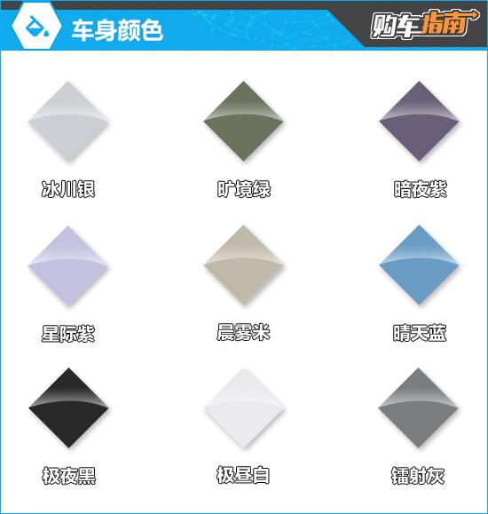 在车身颜色方面,新车提供 9 配色方案,其中极白、激光灰、极夜黑为免费车漆,其它均需付费选择。另外,整个系统都可以选择安装撞色车顶。