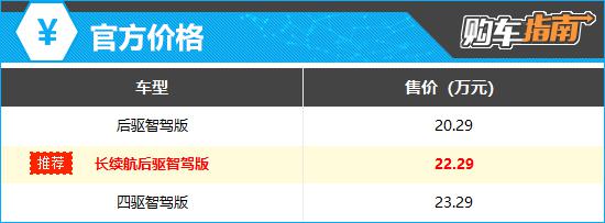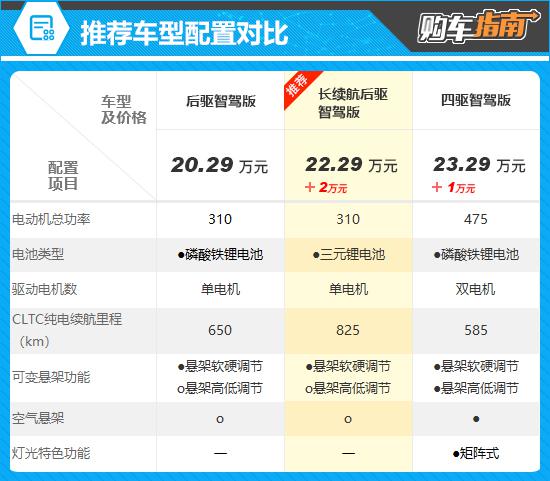 与入门级车型相比,推荐车型的配置没有变化,但是 CLTC 纯电续航里程由 650km 升级至 825公里,电池由磷酸铁锂电池改为三元锂电池,在一定程度上可以摆脱里程焦虑。价格应该更高。 2 一万元,性价比还可以。