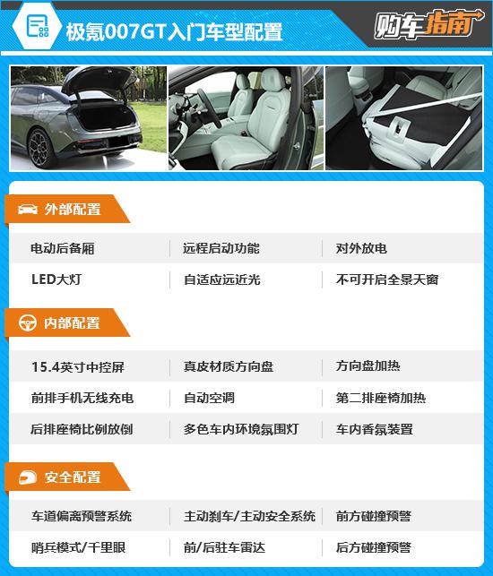 极氪 007GT 入门级车型的配置非常“顶级”。从入门级车型来看,配置包括电动后备箱、对外放电、真皮方向盘、自动空调、第二排座椅加热、后排座椅比例放下、车内香气设备、前排座椅。 / 后停车雷达等配置基本满足了年轻消费者对配置的追求。之所以不推荐这款车型,主要是因为续航稍有不足。