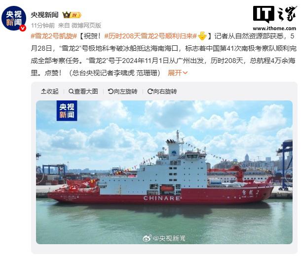 IT 世家 5 月 30 日消息,5 月 28 日,"雪龙 2 "号极地科考破冰船抵达海南海口,意味着中国第一。 41 次南极考察队成功完成了所有的考察任务。据报道,"雪龙 2 "号将在 2025 年 6 月 2 日、3 日、5 日、6 日、7 公开开放日在每天举行,它也是“雪龙” 2 号码第一次抵达琼,向公众开放。
