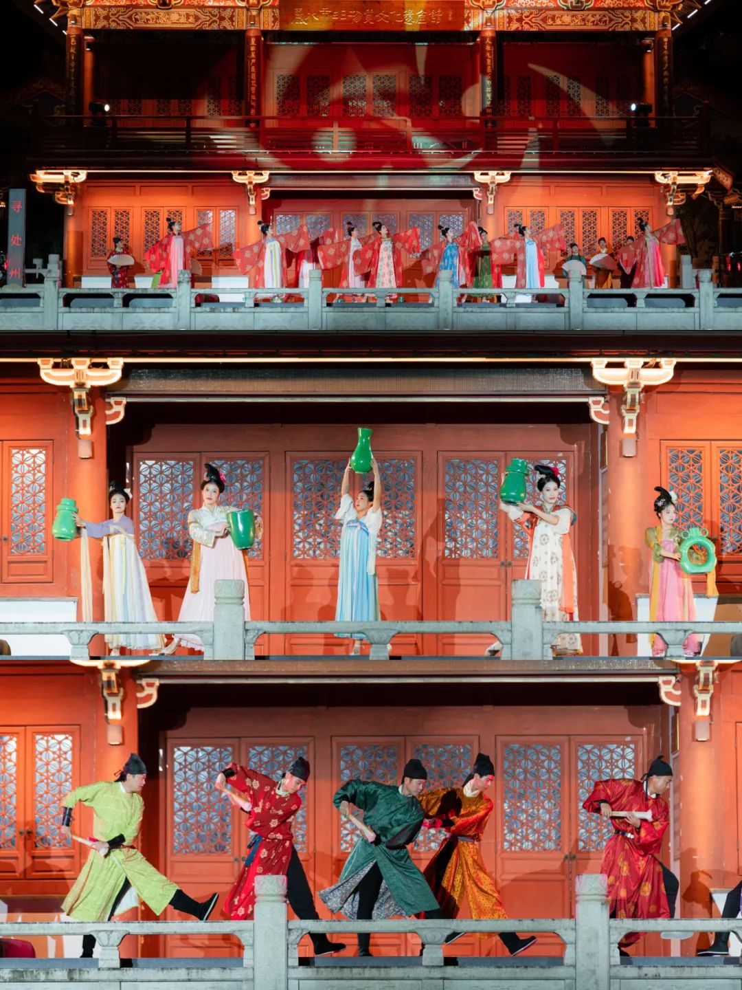 浙江丽水沉浸式非物质文化遗产场景表演,通过应星楼多维情景剧场、非物质文化遗产市场交互体验、瓯江魂实景舞台构建的3D叙事空间,让群众体验非物质文化遗产的互动,创新非物质文化遗产传递的传统方式,让文化遗产在当代生活中焕发青春。应星楼光影剧场采用科技照明,激活文化基因,现场所有观众和演员都沉浸在传统与现代的深情对话中。人们不期而至,让非遗从“被观看的目标”转变为“可参与的场景”,而非遗则不期而至。
