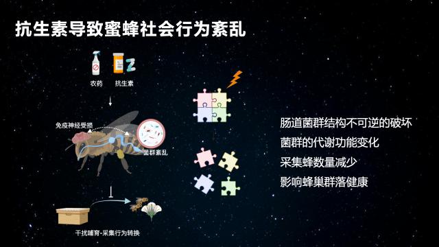 接下来,我们实际上是为了验证抗生素对蜜蜂的影响。我们还在天然蜂场对蜜蜂进行了相当环境的抗生素治疗。发现抗生素治疗后,即使用少量抗生素治疗,也不会影响肠道菌种的数量,但会导致肠道菌群结构的不可逆破坏。这种破坏改变了肠道菌的代谢功能,然后可能通过这种胰岛素来控制。以及能量消耗的调节,影响了蜜蜂行为分工的转化,所以我们也监测了蜂窝中采集的蜜蜂数量。发现抗生素治疗后,蜂窝中采集的蜜蜂数量明显减少,甚至导致采集的蜜蜂数量消失。