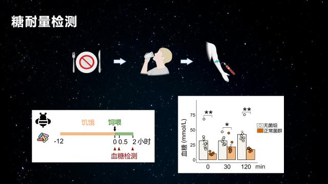 我们知道,其实对于一个人来说,他的血糖一天就变了,比如饭前饭后就不一样了。所以我们去医院做糖尿病检查,医生可以让我们做糖耐量检查。换句话说,晚上空腹后,我们可以喝一大杯葡萄糖水,然后测量饮用糖水前后的血糖含量。因此,参考人类,我们还对蜜蜂进行了糖耐量检查。就是让蜜蜂去饥饿 12 几个小时后,只喂一定量的糖溶液来测量它的血糖含量,然后发现它是无菌蜜蜂,也就是缺乏肠道菌群的蜜蜂。它的血糖含量明显高于正常菌群中的蜜蜂,无论是在饥饿环境中还是吃糖水后。