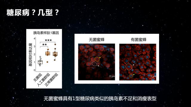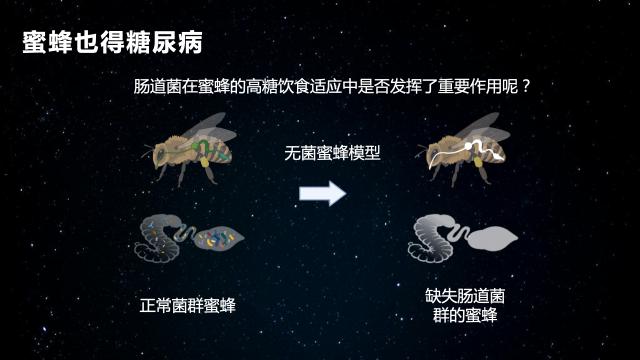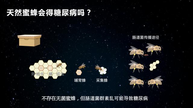 回到蜜蜂和糖尿病的一个问题,是因为我们曾经用无菌蜜蜂做过实验,所以大家肯定会问,这种无菌蜜蜂存在于大自然中吗?天然蜜蜂会得糖尿病吗?我们说自然界没有无菌蜜蜂,因为工蜂羽化后,它会通过各种各样的肠道细菌从蜂窝中获得,比如粪便的传播、哺乳行为和整理行为,以及各种社会生活。