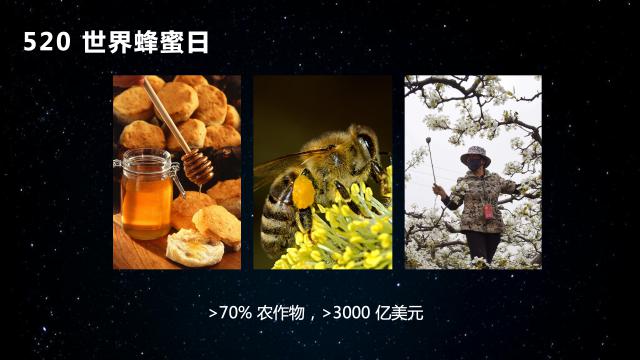 事实上,蜜蜂是一种动物昆虫,每个人都非常喜欢它。它不仅为我们提供美味的蜂蜜,也是一种特别重要的传粉昆虫。蜜蜂超过 70% 农作物传粉,其传粉经济效益超过了 3000 一亿美元,没有蜜蜂,我们的很多农产品都会消失,所以保护蜜蜂,其实就是保护自己。