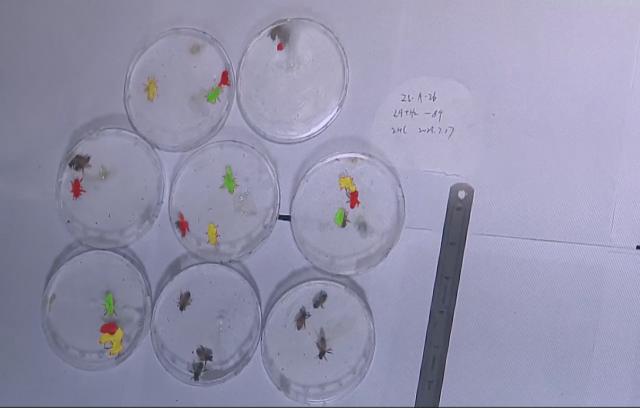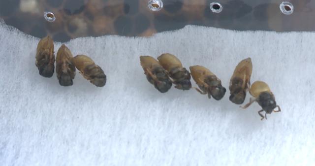 我们可以看到这种透明的,类似于饭盒,里面是蛹阶段挖出来的虫子。我们可以看到它是不动的。我们把这种虫子放在一边。 35 ℃培养箱进行培养 2~3 天啊,然后它就变成了这只羽化蜜蜂,然后我们把这只羽化蜜蜂放在这个无菌的盒子里,喂它灭菌的花粉和无菌的糖水,这样每个人都可以形成一个无菌的饲养系统。得到的是一只无菌蜜蜂。