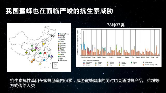 我们早期来自我们国家 14 蜜蜂在各省市地区采样,发现抗生素抗性基因在蜜蜂肠道内大量积累,我们对其进行监测鉴定。 78 种 、37 抗生素抗性基因,而抗生素抗性基因,不仅可以威胁蜜蜂的健康,而且这种天然的昆虫,以及这种天然的野生动物,它也可以作为抗性基因的池塘,比如蜜蜂通过蜂产品和传粉,抗性基因也可以再次传递给我们人类,因此也是对人类健康的威胁。