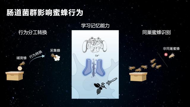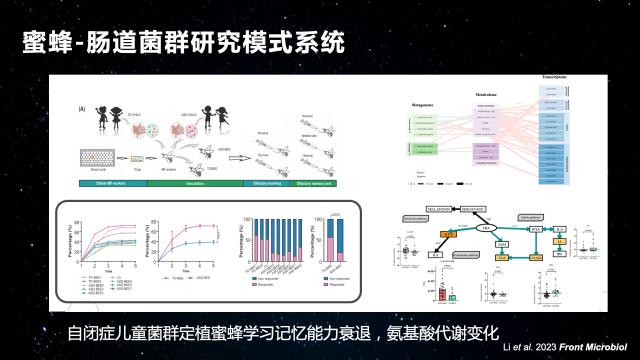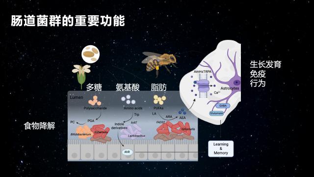 我们把无菌蜜蜂作为一种模型,把人类来源的菌群不是蜜蜂的,而是人类来源的。它们通过代谢对蜜蜂的一些生理产生了影响,产生了像人类一样的自闭症形状,降低了学习和记忆的能力。也就是说,虽然不是蜜蜂的肠道菌群,但是这个菌群中产生了一些物质,使得蜜蜂有一个和人类一样的自闭症形状。事实上,我们还在继续这样做。