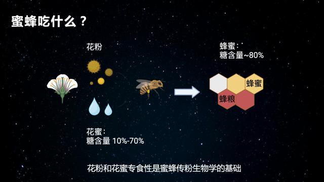 蜜蜂的传粉生物学基础之一是它的花粉和花蜜的特殊食物。它的食物含有各种碳水化合物,但花蜜中的糖含量甚至可以高达 70%,经蜜蜂酿造后酿造成蜂蜜,经过一次水分挥发后,其蜂蜜的含糖量可高达 80%。