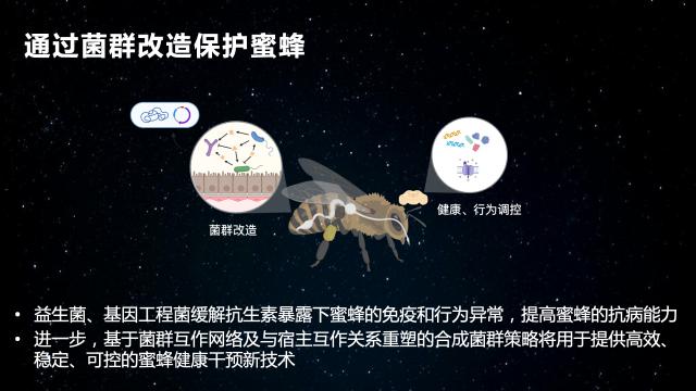 在保持蜜蜂正常生理代谢和行为的基础上,肠道菌实际上可以为我们蜜蜂的健康干预和物种保护提供新的思路,包括益生菌和基因工程细菌的策略已经应用于蜜蜂。抗生素处理减少后,蜜蜂的新陈代谢和行为病变在提高蜜蜂的抗病能力方面表现出一定的效果。