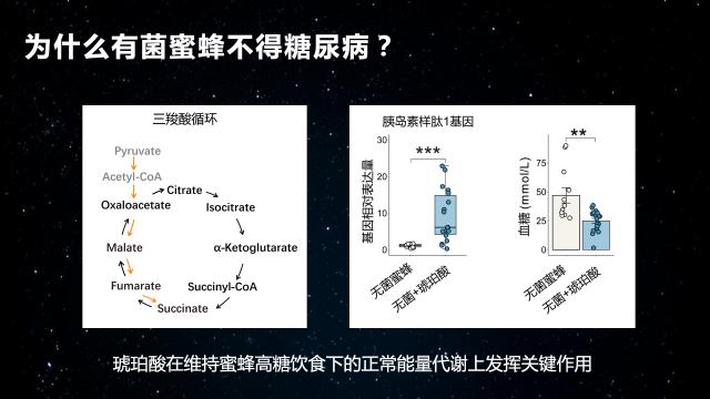 因此,我们还测量了无菌和正常菌群中的蜜蜂的肠道代谢物。我们发现这些不同的代谢物主要集中在重要的能量生成通道——三羧酸循环中,我们发现这只有细菌的蜜蜂可以通过反向三羧酸循环积累琥珀酸。琥珀酸是调节胰岛素表达的重要物质吗?