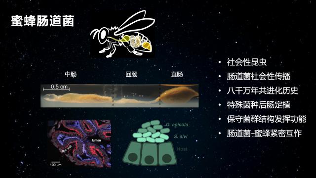 这些肠道菌主要种植在蜜蜂的后肠,相当于我们的大肠。然后这些肠道菌种形成稳定的菌群结构,共同发挥一个功能,所以它们与蜜蜂形成了非常密切的互作关系。