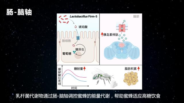我们给无菌蜜蜂喂了琥珀酸,发现喂了琥珀酸后,可以显著激活其大脑中胰岛素样肽的表达,同时降低其血糖含量。此外,通过对这种肠道基因组的测序、肠道细菌的体外培养、单菌的种植等一系列验证,我们发现蜜蜂肠道中重要的乳杆菌主要产生这种琥珀酸。这种肠道的琥珀酸可以通过激活肠道上皮细胞的糖异生来控制大脑胰岛素样肽基因的表达,然后通过这种肠道脑轴来控制。因此,这种肠道细菌的机制在帮助蜜蜂适应这种高糖饮食方面发挥了重要作用。