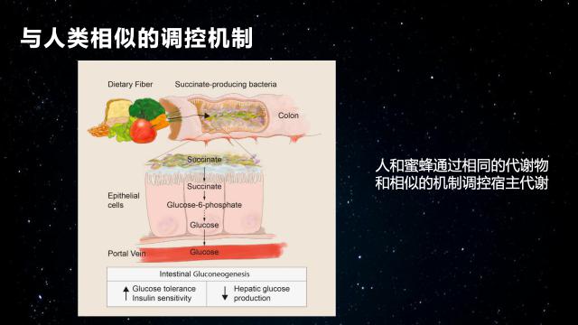 它给了我们人类这些糖尿病什么样的启示?事实上,科学家们也发现,事实上,在人类中,有一种相似的肠道细菌来控制能量消耗的相关机制,然后他们发现,例如,经常吃这种全麦面包或高纤维素饮食的人也会在肠道中积累琥珀酸,而琥珀酸是通过激活肠道糖异生来控制宿主葡萄糖的耐受性和胰岛素的敏感性来控制的。通过这种类似的机制来控制整体的能量消耗。