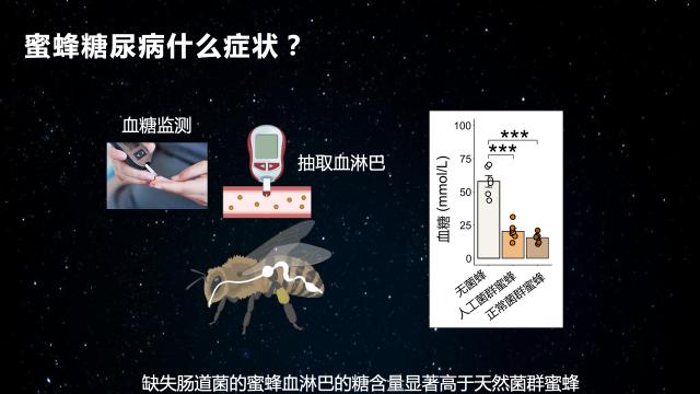 人类糖尿病的主要表现是什么?就是高血糖,所以糖尿病患者要经常用血糖仪来监测血糖的含量,所以我们也给蜜蜂做了同样的检测,就是从它的胸部和腹部体节中提取血淋巴来检测糖的含量,然后发现真正无菌的蜜蜂的血糖含量明显高于正常菌群的蜜蜂。